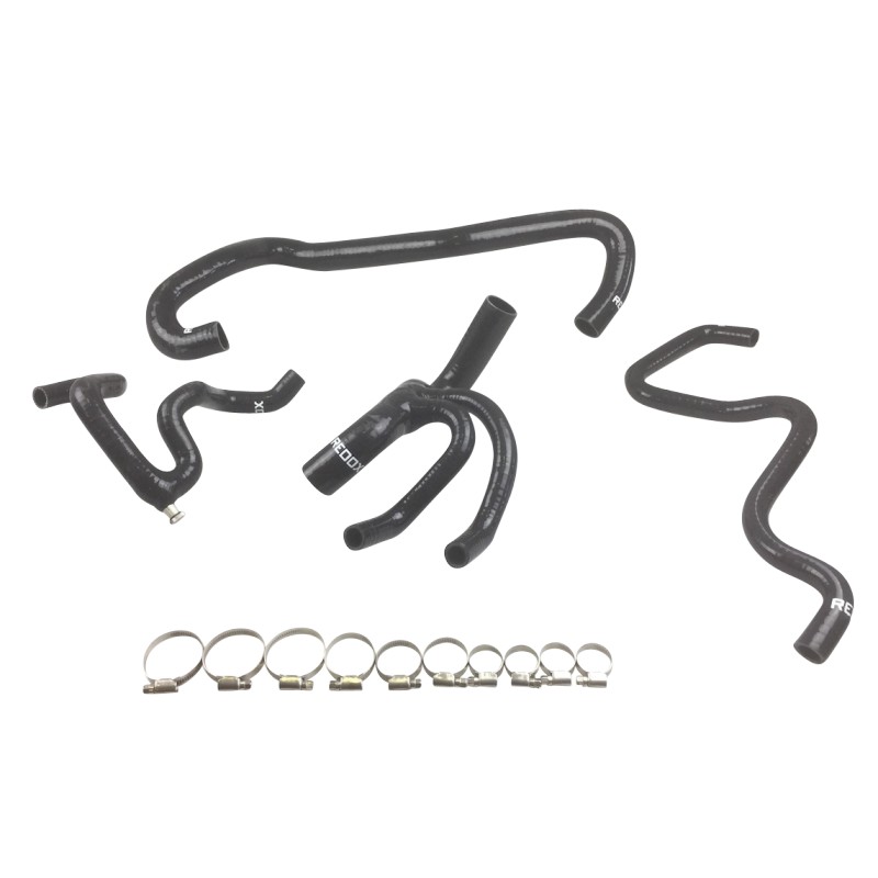El kit completo incluye los 4 manguitos esenciales del circuito de refrigeración: 2 manguitos de radiador y 2 manguitos de calefacción. Todas las abrazaderas de apriete necesarias para el montaje están suministradas. El reemplazo se realiza exactamente en la ubicación original sin ninguna modificación.